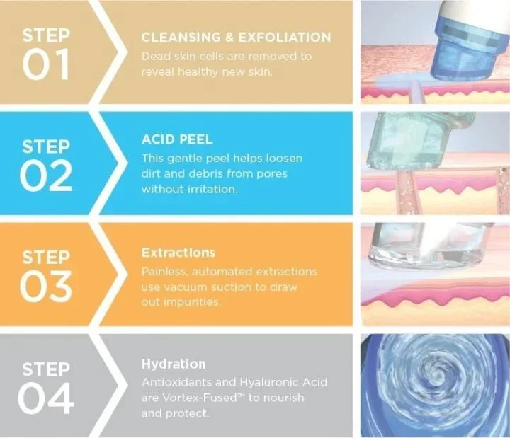 The Hydra therapy facial resurfacing procedure thoroughly enhances the skin using our patented Vortex Technology. Hydra therapy facial uses a patented device that creates a vortex to suction away dead skin cells, oil, and dirt. Simultaneously, it bathes your skin in moisturizing and cleansing solutions full of hydrating ingredients, antioxidants, and peptides. Hydra therapy facial is a non-invasive, non-surgical procedure that delivers instant results with no discomfort or downtime. The procedure is soothing, moisturizing, non irritating, and immediately effective. Thanks to the cleansing and exfoliation, dead skin cells are removed to reveal healthy new skin.