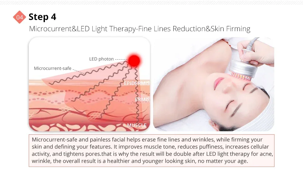 The Photon Micro current Beauty Device, designed for facial beautification, uses natural light waves, which are transmitted by LED into the skin. The light activates photoreceptors in skin cells, producing energy for absorption by skin components, to beautify your complexion.