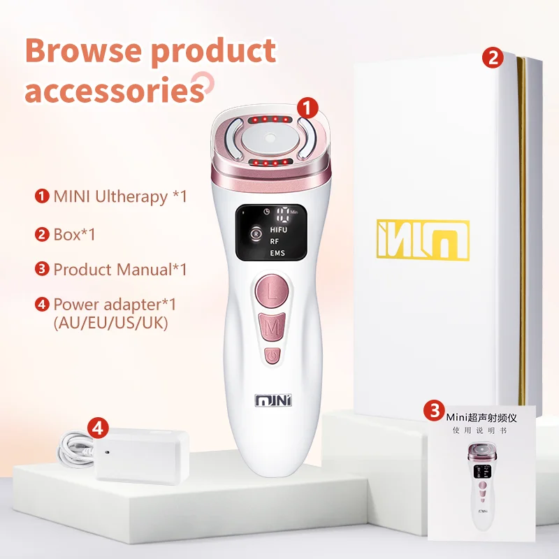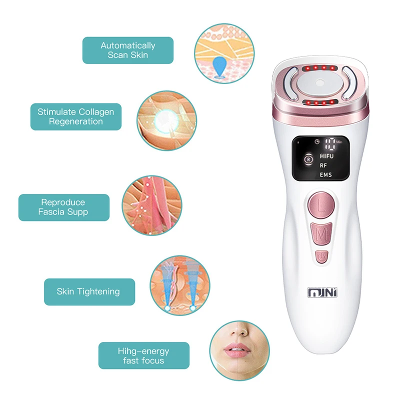 New Mini HIFU Machine EMS&RF Ultrasonic Massager for Firming Skin Care Anti Wrinkle Professional Antiaging Portable Beauty Device Comprehensively improve HIFU - non-invasive, non-surgical, non-injection, pull & lifting technology. There are 4 function : HIFU Function +RF ( Rodio Frequency)+EMS Micro Current +PULSE+Blue/Red/Green/Purple LED Light