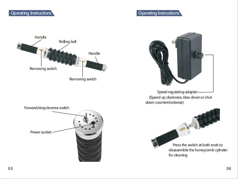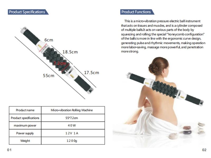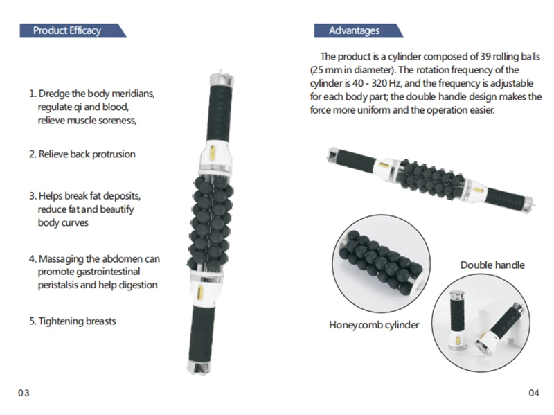 1.The product is a cylinder composed of 39 rolling balls (25 mm in diameter). The rotation frequency of the cylinder is 40 - 320 Hz, and the frequency is adjustable for each body part; the double handle design makes the force more uniform and the operation easier.
