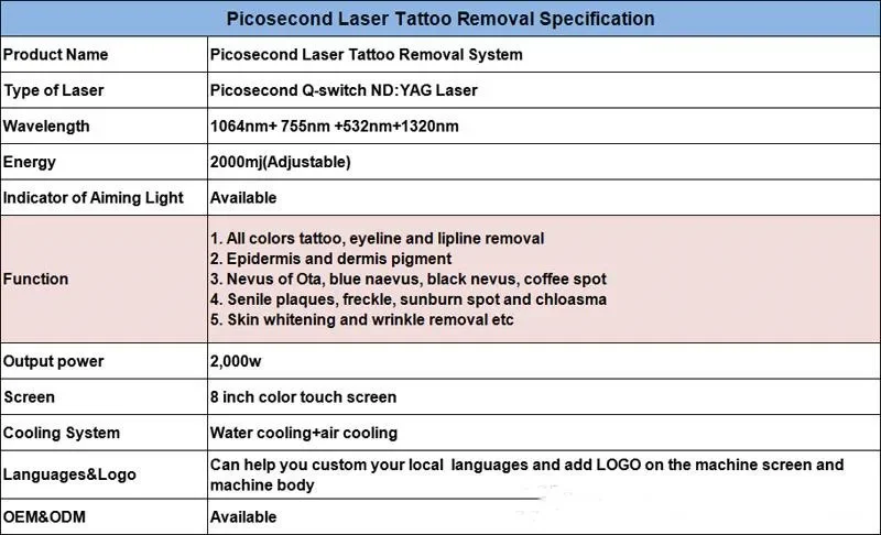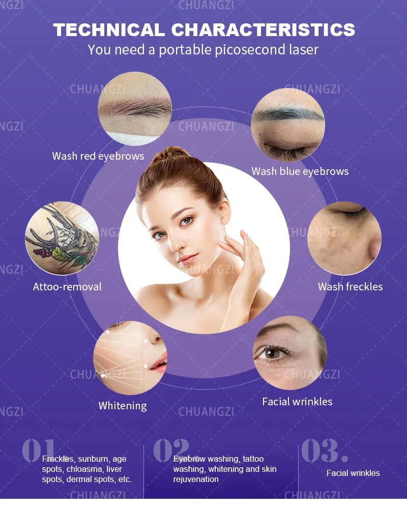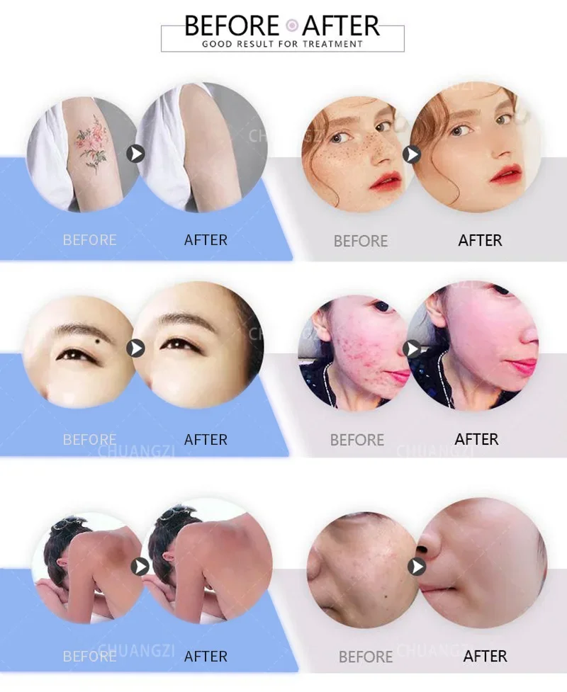 3.Comfortable&Safe—It can remove all kinds of pigment and tattoo effectively and safely,because picosecond laser use precise positioning of the target tissue therapy to reduce damage to the skin to achieve the freckle removal effect.