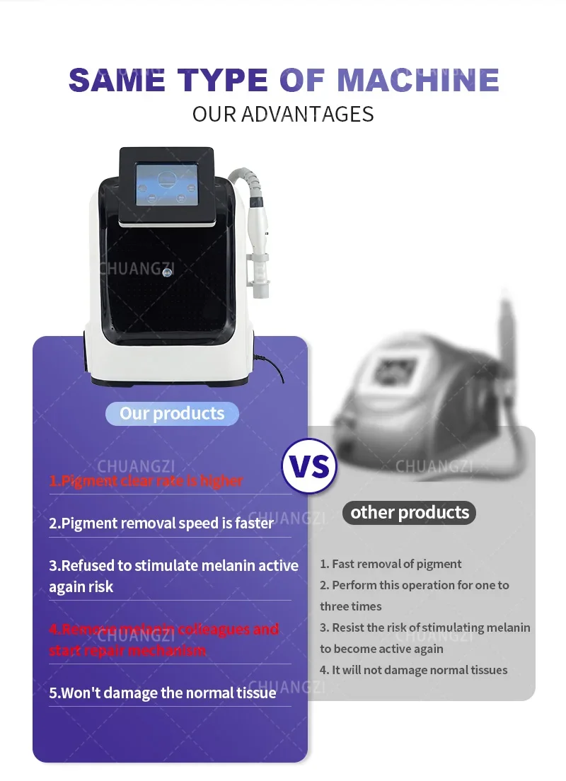 2.Fast Effective—Pico laser machine make tattoo&pigment removal treatment process from 5 to 10 times reduced to 2 to 4 times,greatly reduce the treatment and recovery time,with fast and obvious effect.